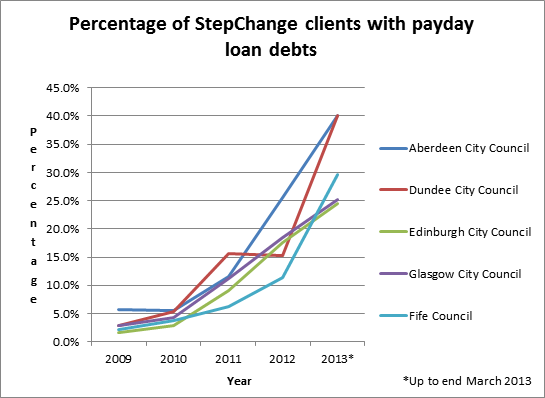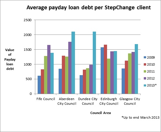 New data shows that the number of Fife clients of StepChange Debt Charity with payday loans almost tripled between 2012 and the first three months of 2013, rising from 11% to 30%. Between 2011 and 2012, the average amount owed increased from £375 to £1,656, though this dipped to £1,385 in March 2013.
