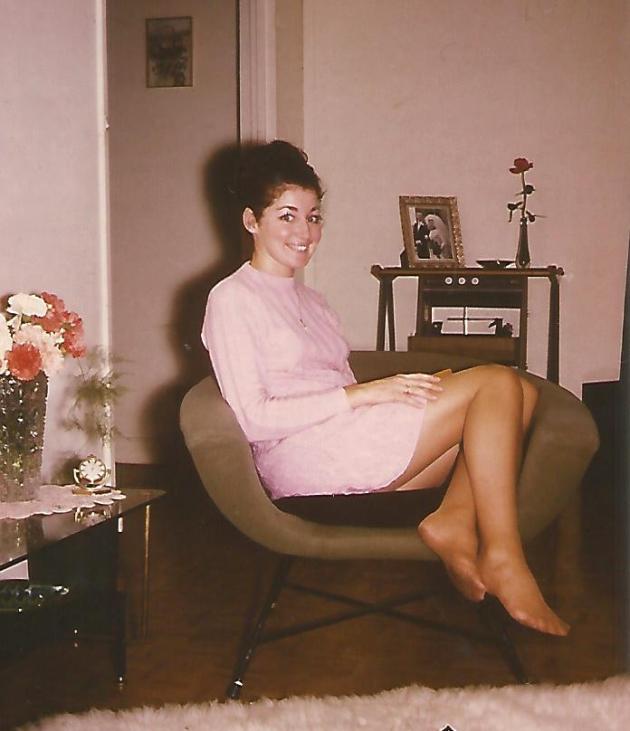 4.07 Maureen on her 23rd birthday in our French apartment – among the flowers and in front of our wedding photograph. Nov 1969