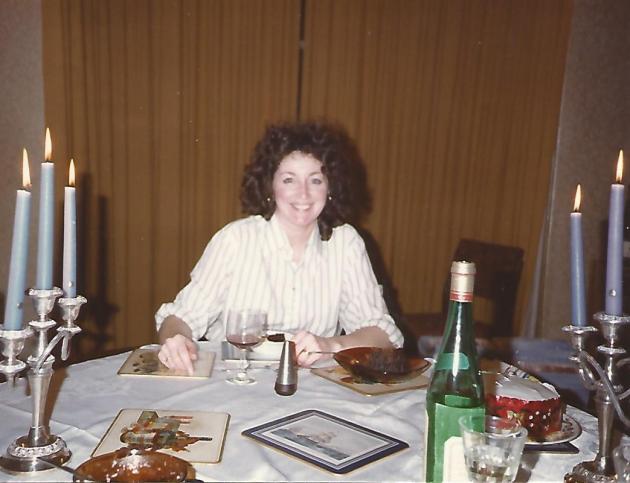 15.03 Cook Maureen, still in her kitchen smock (one of my shirts), enjoys her Christmas dinner at Dalrymple Cresecent. 1985